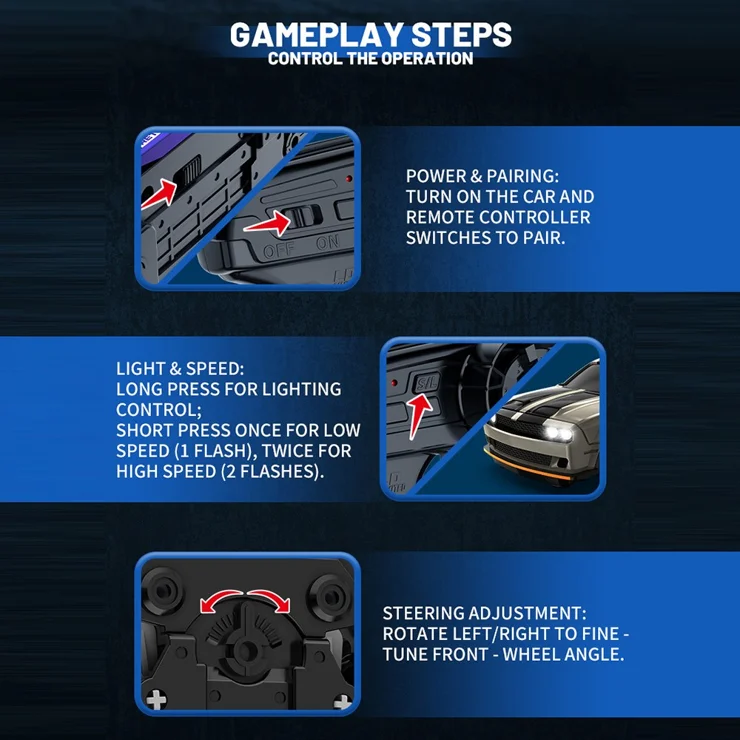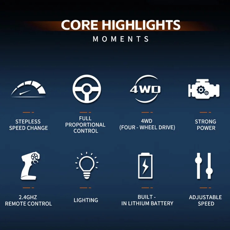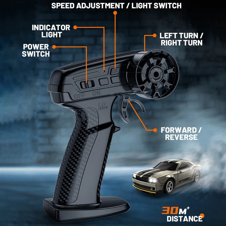 با استفاده از ریموت کنترل 2.4 گیگاهرتزی میتونی بدون نگرانی از قطع شدن ارتباط یا تداخل سیگنال، ماشین رو کنترل کنی. این سیستم بردی حدود 20 تا 30 متر داره و امکان کنترل نرم و دقیق سرعت و فرمان رو فراهم میکنه.
